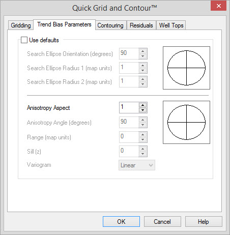 diagonal. When using Kriging as the gridding method, you can specify the Search Ellipse and Anisotropy independently to skew the resulting grid. For information on all parameters see the Anisotropy and Search Options page in Grid and Contour. |