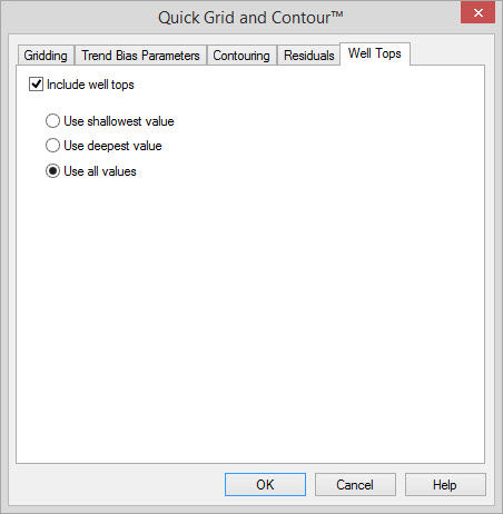 with the seismic data, ensure that this is checked on. Use shallowest value: In the case of multiple well tops values, only the shallowest one will be used. Use deepest value: In the case of multiple well tops values, only the deepest one will be used. Use all values: In the case of multiple well tops values, all data values will be used. This may result in averaging. |