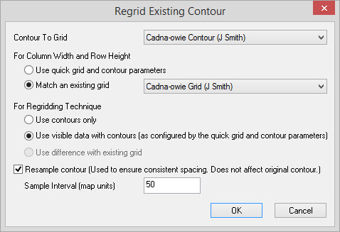 Contours To Grid: This combo box contains a list of available contours that may be regridded. Use this to select the contour to regrid if the one displayed is not correct.