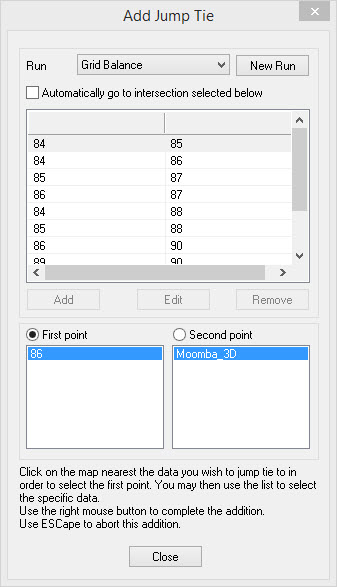 Add: After clicking Add, the "First Point" and "Second Point" lists will become enabled. Clicking on the map will select the first point and the second point alternately. You may use the list to change the default data item selected. Click the radio button beside "First Point" or "Second Point" to edit the appropriate point. Once you are content with the intesection, use RMB to end the selection.
