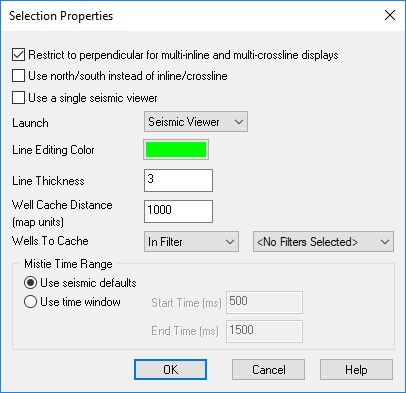 The Selection Properties dialog allows you to specify parameters used when selecting seismic as well as determining the number of wells that will be loaded into memory when the Seismic Viewer is launched. It can be accessed from the Edit menu.
