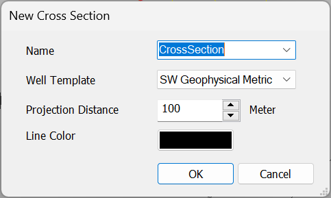 Create Cross Section: Create a cross section. Use the left mouse button to select wells or add an x/y node on the Basemap. Click the right mouse button to finish your cross section. You will then be prompted to specify a cross section name, your desired well template, project distance, and cross section line colour in the New Cross Section dialog.