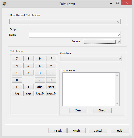 Expression: Displays the final output computation expression. The expression is created by selecting Variables and from the drop down, and using the keypad to select operators and constants.