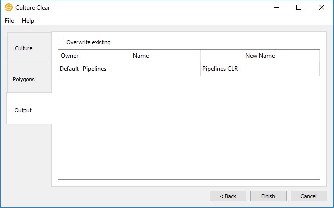 The Output page allows you to change the output name(s) for the culture layer(s). By default, the new culture layer will have *CLR appended to the name. You also have the option to overwrite the culture layer if it already exists.