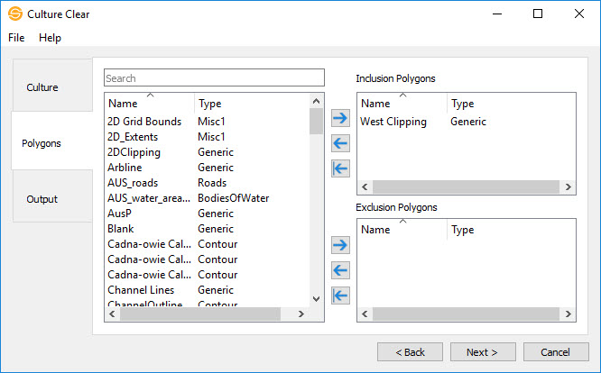 This area will display a list of culture layers to be used as inclusion polygons in the clearing operation. Any data within your inclusion polygon will be cleared.