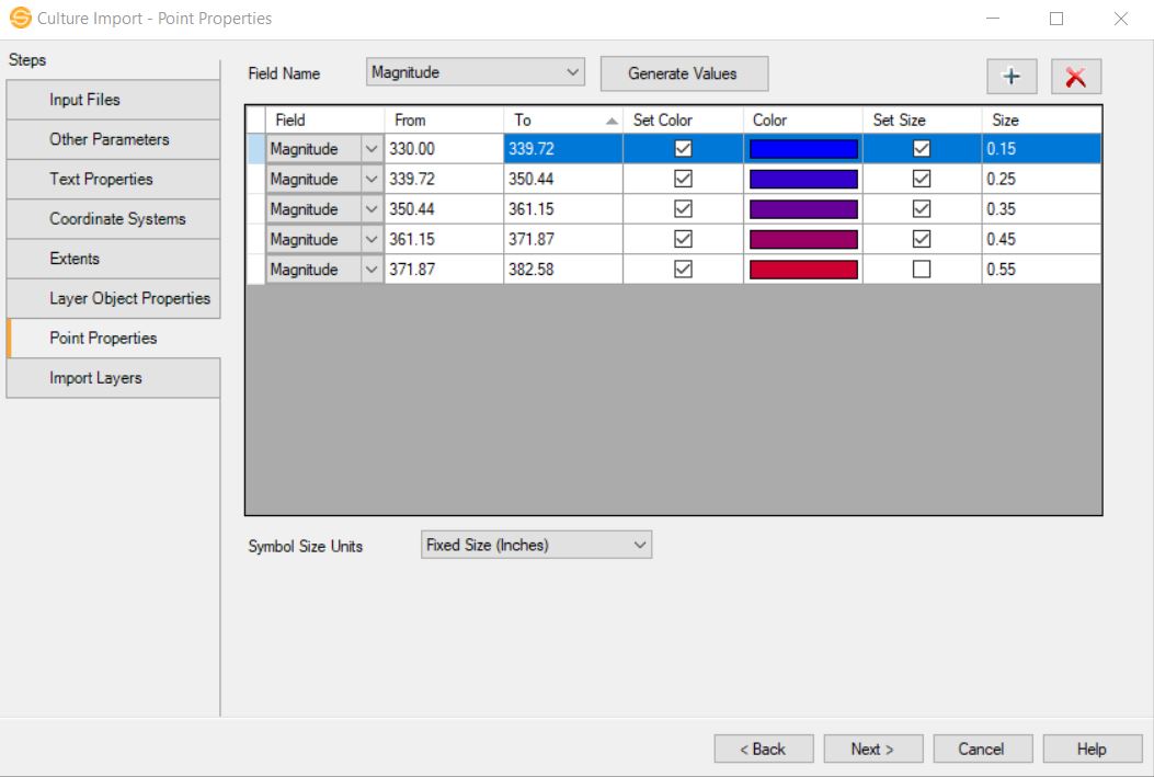 Using information from the import file, you can automatically generate a table of values that specifies the color and/or size property that will be applied to each object based its value. The data ranges, colors, and sizes can then be manually edited directly in the table so you can create a meaningful display in your project.