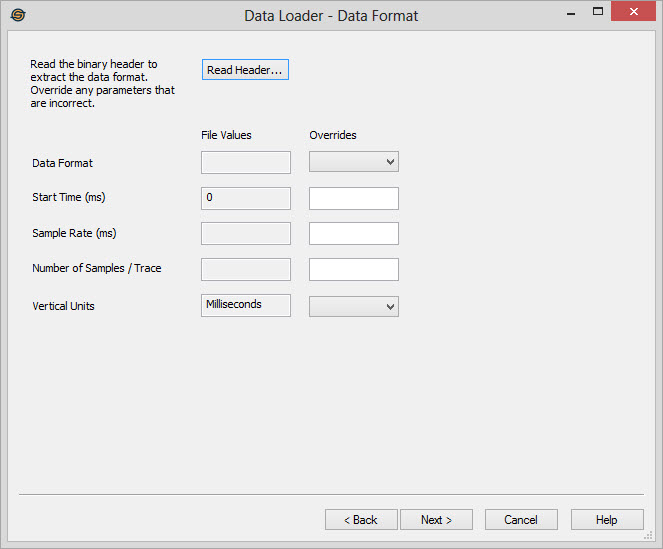 Vertical Units:Specify the vertical dimension the trace data in the file. This will be either Milliseconds, Meters or Feet. This override allows you to specify the measurement units of depth seismic which is not defined in a standard SEG-Y file.