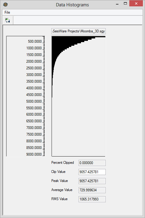 This display represents a histogram of the data in each file you have scanned. The Y axis represents amplitude and the X axis represents the number of samples of data at that amplitude. The data will typically be a half bell-shaped curve. If it is not it may indicate a problem with the data format.