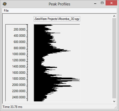 Show peak profiles: Check this item to generate the optional peak profile graph. This is a graph of the maximum absolute sample value for all the traces scanned at each point in time. This graph can help identify spikes in your data, or reveal your zone of interest.