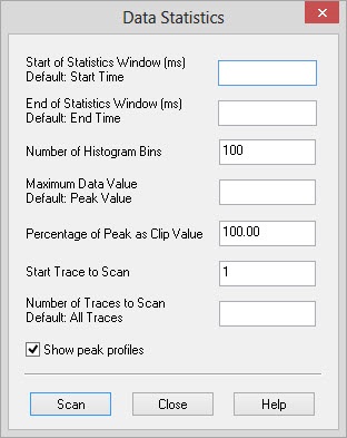 Number of Histogram Bins: Calculating the statistics generates a data histogram. This value specifies the number of bars to divide the histogram into. The default value of 100 is normally sufficient, although you may want to increase this number to isolate spikes in the data.