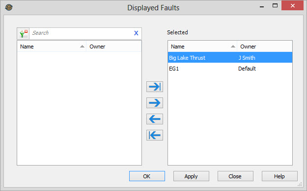Select the faults that you want displayed in the Seismic Viewer. Left click to select a fault, or use the Ctrl key on your keyboard to select multiple faults, and then use the selection arrows to move the faults to the Selected list. Alternately, you can move a single fault to the Selected list by double clicking on it.
