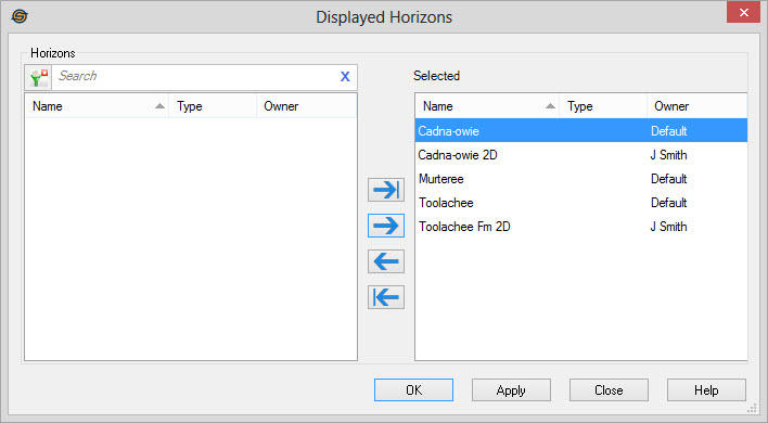 Select the horizons that you want displayed. Left click to select a horizon, or use the Ctrl key on your keyboard to select multiple horizons, and then use the selection arrows to move the horizons to the Selected list. Alternately, you can move a single horizon to the Selected list by double clicking on it.