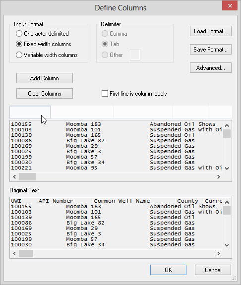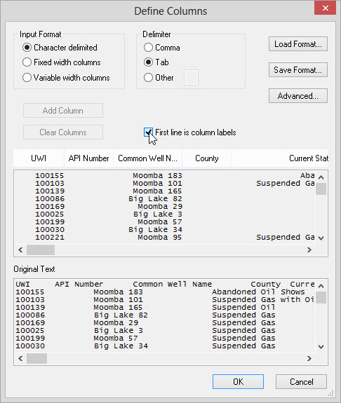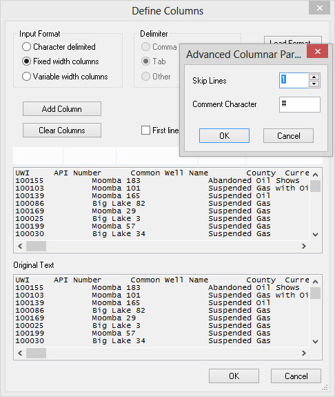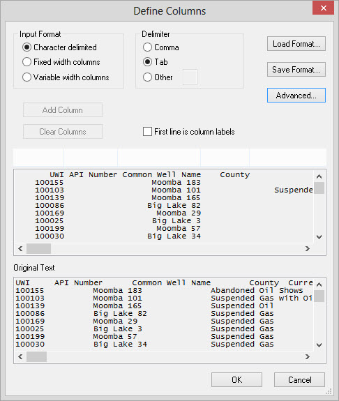 Columnar ASCII files can be used to import wells, horizons, faults, and culture, as well as when gridding and cross plotting XYZ files. In all cases you will be required to define the columns.