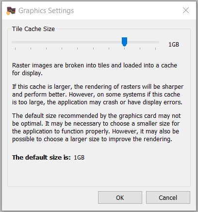Graphics Settings: This opens the Graphics Settings dialog where users can adjust the Tile Cache Size for raster log images. By default the cache is set to 1 GB however users may need to decrease this for functionality or increase this to improve performance and rendering.