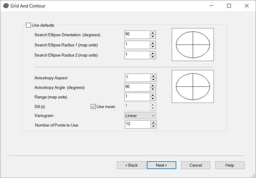 If a gridding technique that supports anisotropy (such as kriging or minimum curvature) was selected as the Gridding Technique this page will appear to specify the parameters for the Search Ellipse, Anisotropy Angle, Anisotropy Aspect, Range, Sill and Variogram.