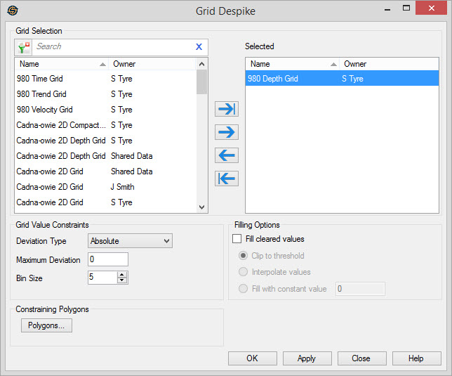 Select the grids you want to despike. Left click to select a grid, or use the Ctrl key on your keyboard to select multiple grids, and then use the selection arrows to move the grids to the Selected list. Alternately, you can move a single grid to the Selected list by double clicking on it.
