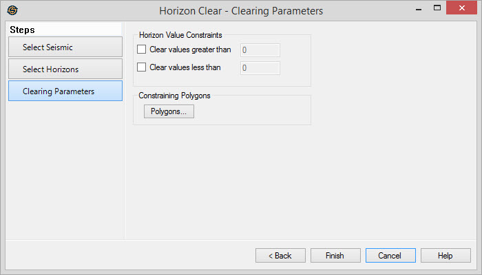 The Clearing Parameters page of the Horizon Clear wizard allows you to select polygons to limit the geographical area on the clearing operation, or to set horizon value constraints to clear outliers from horizons. If Horizon Value Constraints are set, horizons will not be cleared unless they meet the constraint criteria.
