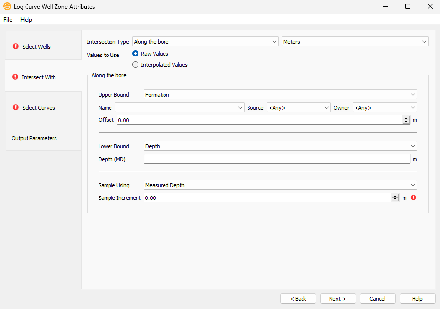 Formation: Select a formation to act as a boundary, and optionally choose Source, Owner, and Offsets using the selected Units. Note: if a source and owner are not defined, then the lowest MD (top most) and highest MD (bottom most) formation will be used.