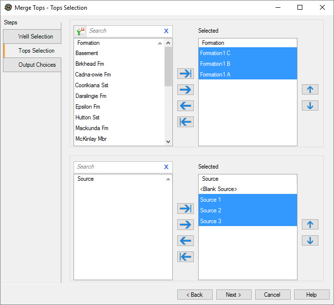 Select one or more tops to merge. The tops can be moved between the Available and Selected lists using the selection arrows, or by double clicking on a single source. Sources need to be selected in a specific order when they are being used define the merge behavior. To make tops selection easier type a search string into the search bar to limit the list based on Formation name.