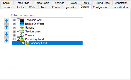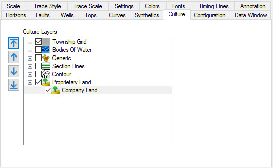 The Culture page allows you to specify which culture layers to use in seismic sections or slices. When displaying a seismic line, any culture that is selected will display a vertical line where the seismic intersects those culture layers. If you are displaying a slice, any culture selected will display like it would on the Basemap. Layers will initially be in the same as the Basemap, but after modification they will remain independent of the settings found on the Basemap.