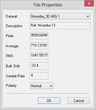 The File Properties dialog displays a few basic properties of the seismic sections being displayed in the viewer. These values are the values stored in the database and match those seen the Line Propertieswindow.