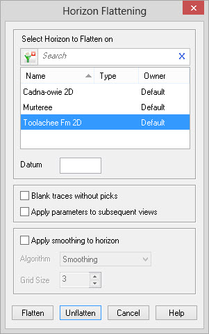 Apply smoothing to horizon: When toggled on the horizon will have a smoothing algorithm applied to it before the data is flattened. This can be used to provide a smoother, more presentable flattened display. When toggled off no smoothing is applied to the horizon before it is flattened.