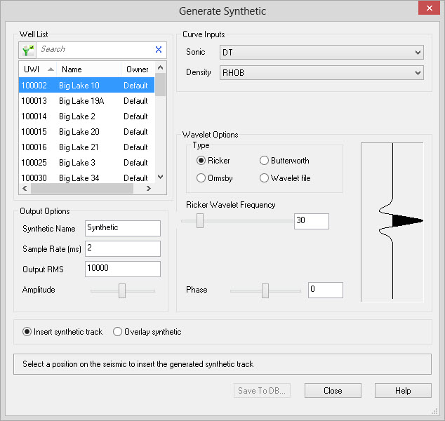 Once you have selected the well, and specified all desired parameters, you insert it into the seismic display by left clicking on the seismic display. The synthetic will be inserted and the dialog will close.