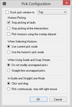 The Pick Configuration dialog box allows you to specify certain picking behaviors, as well as specify a docking location for the Pick dialog box.