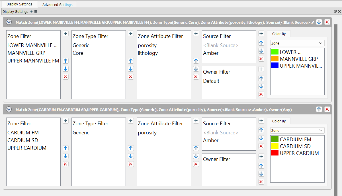Display Settings in Set Displayed Zones is used to define your displayed zones as well as set rules for your zones. Each Match Zone entry can have multiple zones, types, attributes, expressions, Sources, and Owners.