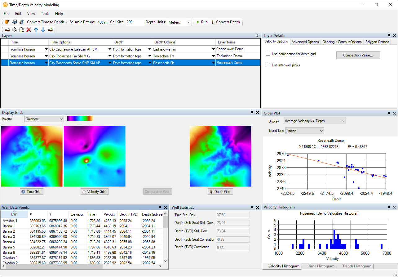 The Time/Depth Velocity Modeling application is used to convert time surfaces to depth, and depth surfaces to time. The conversion can be done for a single layer, or for multiple layers, in one operation. You can customize the gridding technique and data inputs for every layer. After completing the time/depth calculations, you can create a velocity model to convert seismic volumes, horizons, and faults between time and depth.