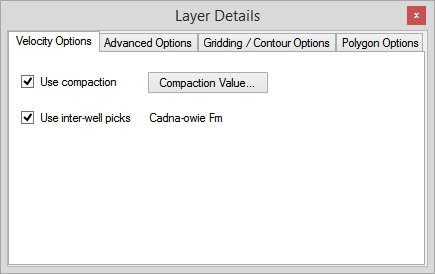 The Layer Details dialog box is used to set properties specific to the layer currently selected in the Layers dialog box. This includes turning on compaction and inter-well picks, overriding default gridding and contour parameters, and selecting polygons.