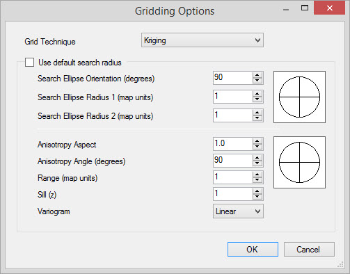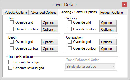 The Gridding/Contour Options tab in the Layer Details dialog box is used to override the default grid and contour parameters, and create trend and residual grids for the layer currently selected in the Layers dialog box.