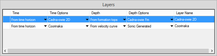 The Layers dialog box is used to specify the method to use to obtain input data, select the input data, and name the output grids. The options available in this dialog box will be different if you are performing a time to depth conversion, or a depth to time conversion.
