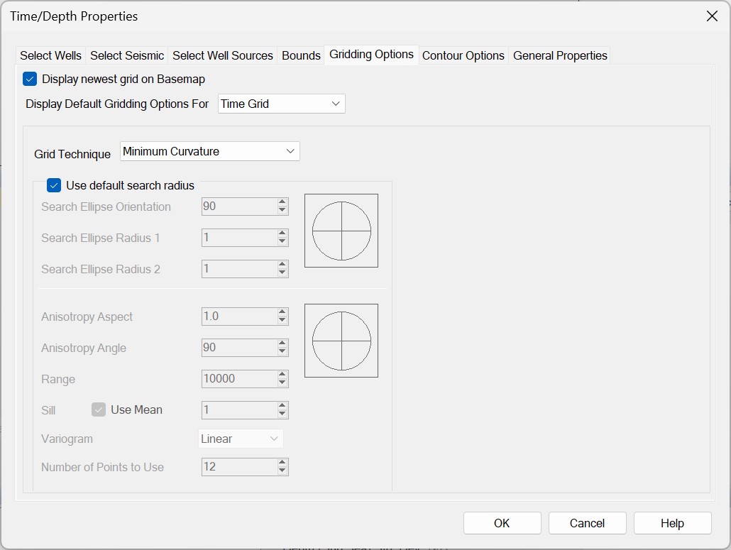 The Gridding Options tab in the Time/Depth Properties dialog box is used to define the default gridding parameters for the calculation.