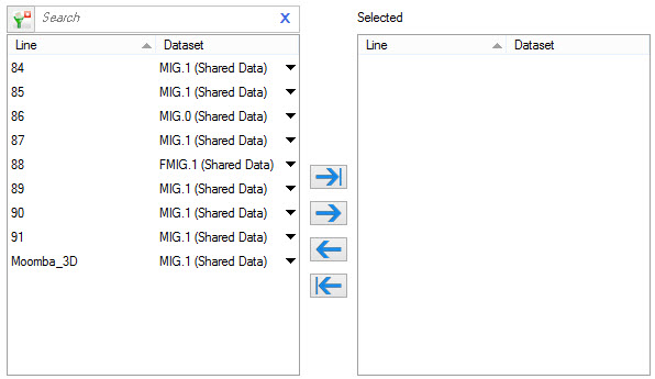 Select the seismic lines that you want to use in the calculation. The working set version is listed, but alternate datasets can be selected by clicking the down arrow in the Dataset cell. Left click to select a seismic line, or use the Ctrl key on your keyboard to select multiple seismic lines, and then use the selection arrows to move the lines to the Selected list. Alternately, you can move a single line to the Selected list by double clicking on it, and move a group of lines by selecting them from the Basemap.