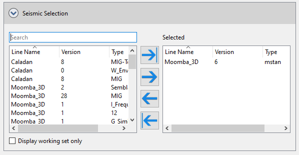 Moving lines to the selected column on the right side of the dialogue will limit the calculation to horizons defined above that exist on selected seismic lines.