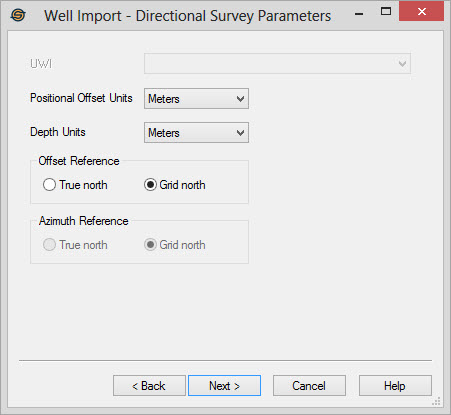 The Directional Survey Parameters page of the Well Import wizard allows you to specify additional parameters when importing directional surveys from a columnar ASCII file.