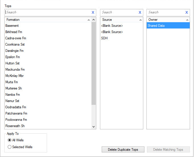 The Advanced Tops tab allows you to delete multiple tops from multiple wells in one operation, and allows you to remove duplicate tops from the database.