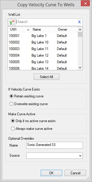 The Copy Velocity Curve To Wells dialog allows you to copy a velocity