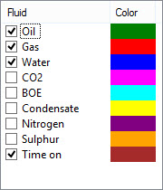 Fluids: Select the fluids you want included in the table or graph by placing a check mark next to the fluid name. To change the display color, click on the color in the Color column, and select a new color from the Color dialog box.