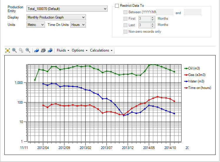 - Monthly Production Chart: Display the monthly production values as a graph. The displayed data can be limited using the Fluids selector, and the Restrict Data To options.