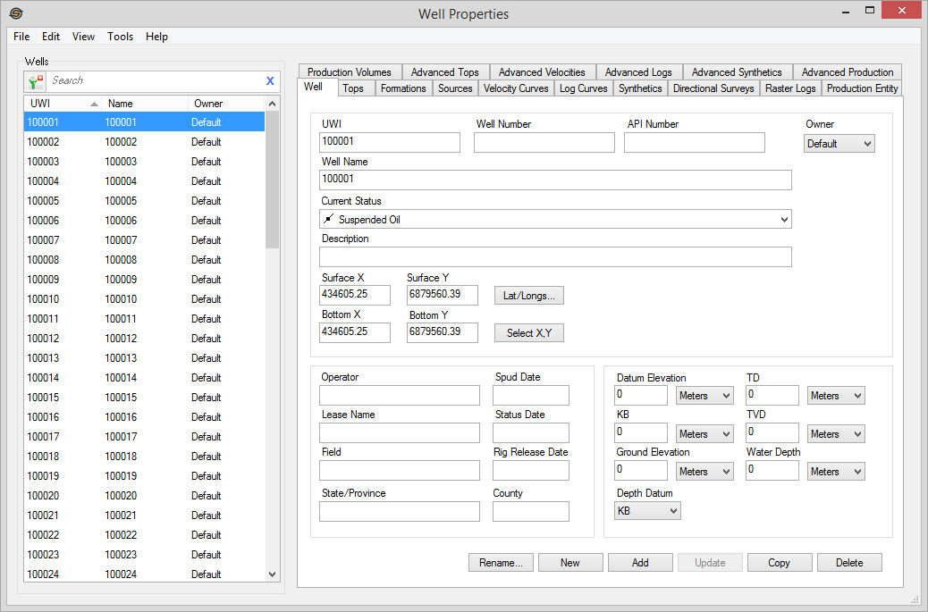 The Wells List area of the Well Properties dialog displays a list of all of the wells in your project. When a single well is selected, all of the information associated with the well will populate the Wells, Tops, Velocity Curves, Log Curves, Synthetics, Directional Survey, and Raster Curvestabs on the right portion of the dialog. When multiple wells are selected, no information will appear on these tabs.