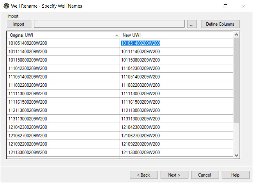 Use the Specify Well Names page to enter new values for the UWIs for