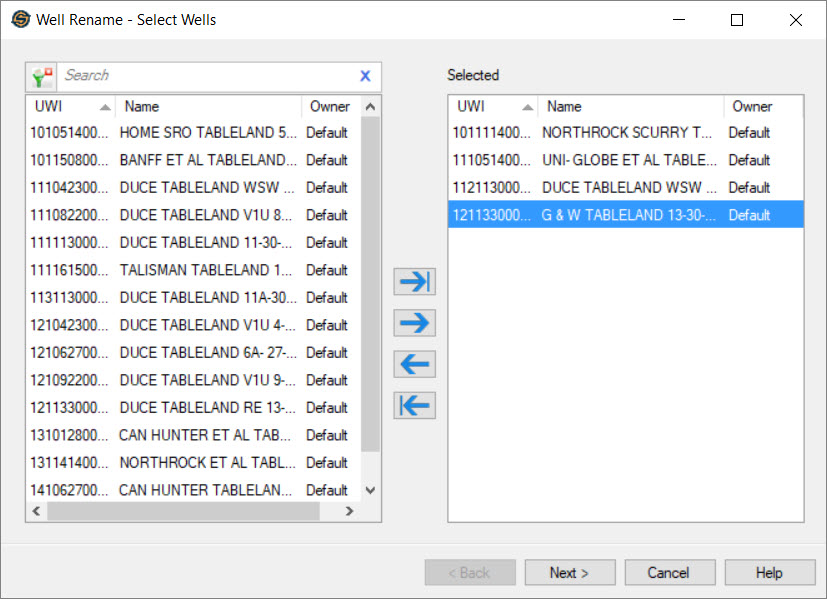 Select the wells that you want renamed. Left click to select a single well, or use the Ctrl key on your keyboard to select multiple wells, and then use the selection arrows to move the wells to the Selected list. Alternately, you can move a single well to the Selected list by double clicking on it, and move a group of wells by selecting them from the Basemap.