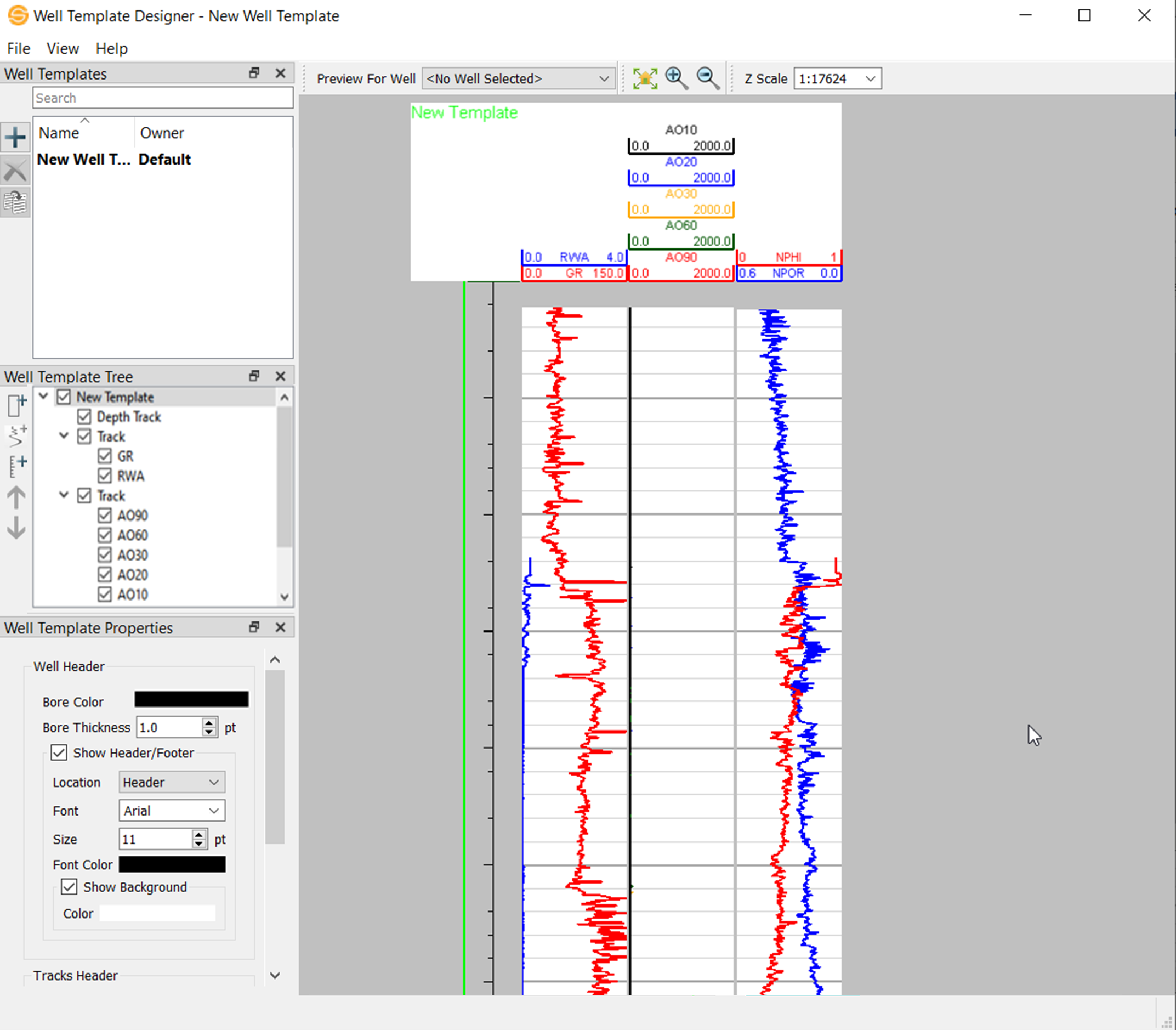 The Well Template Designer window is used to create new log templates for use in applications like the Cross Section Viewer, as well as copy, rename, and delete existing templates.